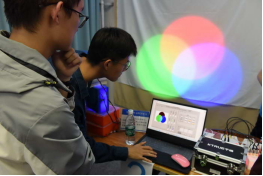 照片5 亲手混色,感受光的奇妙 | 照片6 留学生抢着尝试将地球仪悬浮起来 |