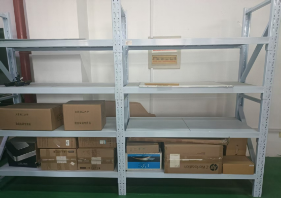 实验室设置专用的储物与耗材区,区域内整齐摆放太原理工大学定制款物流实训专用箱,箱内分类收纳各类物流实训专用耗材、扫码设备配件、仓储模拟物料、办公文具等,做到分类清晰、标识明确、取用方便。