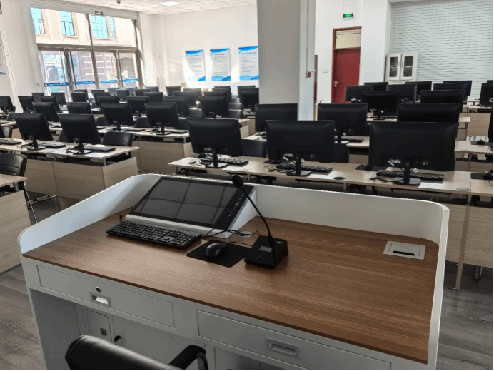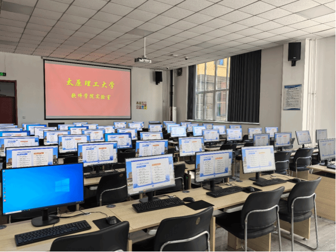 每间实验室部署性能先进的学生机(13代10核16线程i7 CPU,32G内存,500G硬盘),多媒体设备、无线网络。教师机配有“多媒体网络教室软件”,可以实现屏幕广播、文件收发、电子点名、行为管控等功能,可以提高教师的课堂教学效率和管理。讲台配有无线麦克风、视频高清线、网线、音频线。学生机安装有基础软件和软件工程专业软件,可以开展课程实验、课程设计、毕业设计、线上教学、创新实践课程等教学环节。