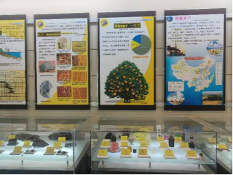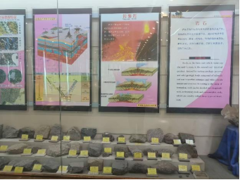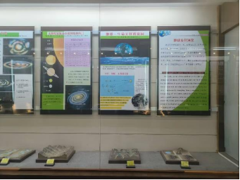 第一部分有常见地形地貌的模型教具,比如河流地貌,喀斯特地貌,风蚀地貌,风积地貌及展板上展览的关于地球内部岩浆运动和地球形成假说的内容。