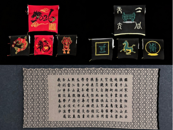 在实践教学与科研中,学生们利用多彩纱线色卡和设备功能,既能设计制作将传统文字、图形元素转化为精致图案的小型织片,也能通过大幅面编织呈现完整设计意境的大型作品,充分展现传统工艺与现代技术的创新融合。